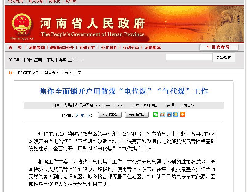 報道中具體談到“(焦作)要求10月底前,市、縣兩級建成區范圍內,嚴禁新建燃煤鍋爐,嚴禁燃煤散燒。在未實現集中供熱的區域應加快集中供熱管網延伸,優先發展集中供熱,其余供熱管網無法覆蓋區域,按照宜氣則氣、宜電則電的原則,完成省下達的“電代煤”“氣代煤”改造民生工程6萬戶任務;在商業和公共領域推廣熱泵采暖100萬平方米以上;1萬戶以上農村居民永久性實現廚炊電氣化。”