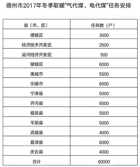 德州是中國太陽城、中國功能糖城、中國優秀旅游城市以及國家交通運輸主樞紐城市,近年來不斷在改善生態環境、治理大氣污染工作上取得實質性進展。德州作為山東傳輸通道重點城市之一,在2017年民用煤改6萬戶的基礎上再度增加數量預計8-10萬戶,預計2018年綜合取暖改造將達到15萬戶(單位)以上。
