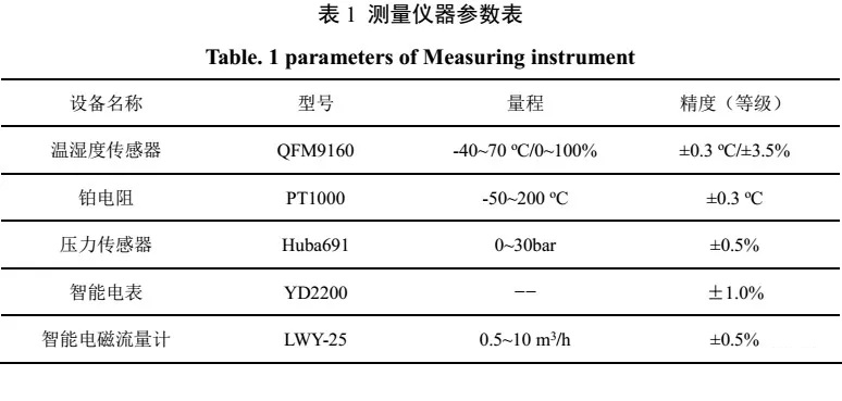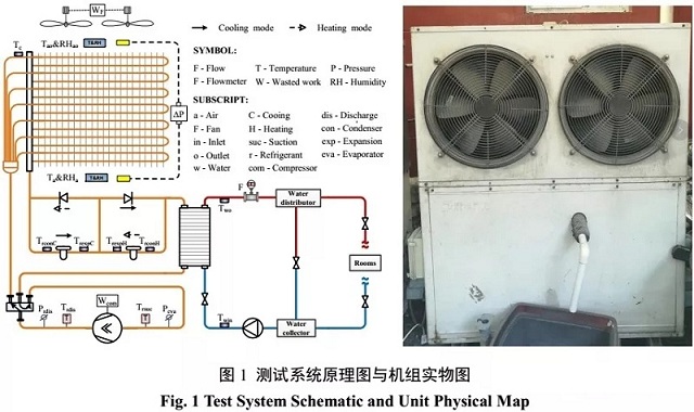 測試系統(tǒng)對空氣源熱泵的空氣側(cè)、制冷劑側(cè)與制取熱水側(cè)的運行參數(shù)以及能耗情況進行實時監(jiān)測。測試機組原理圖與實物圖如圖1中所示,在壓縮機吸/排氣管上分別設(shè)有溫度和壓力傳感器監(jiān)測壓縮機的吸/排氣溫度和壓力,在水側(cè)利用鉑電阻PT1000測量機組的進/出水溫度,利用電磁流量計測量水流量。其中主要的測量儀器參數(shù)如表1所示。