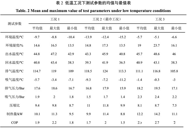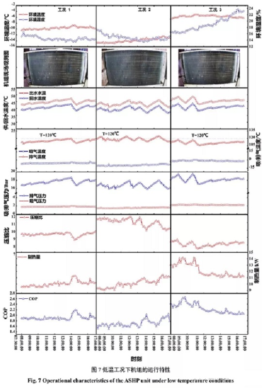 (3)最冷工況下,環(huán)境溫度均值-13.9℃,壓縮機平均排氣溫度為118.5℃,最高達到124℃,且機組有25%的時間其排氣溫度超過120℃,最高壓縮比達到11.7;運行期間機組頻繁發(fā)生“無霜除霜”的誤除霜事故以及頻繁停機的運行故障,機組的平均制熱量僅為9.9kW,COP為1.71,當溫度低至-15.2℃時,制熱量衰減幅度高達55%,COP僅為1.49?梢,低溫嚴重影響熱泵的正常運行。