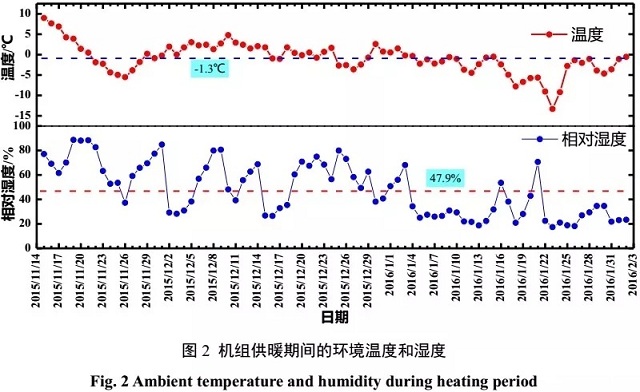 測試期為2015年11月15日至2016年2月2日。為詳細考察空氣源熱泵在測試期內(nèi)的運行性能,尤其在低溫工況下的性能,全面測試了室外溫濕度,壓縮機吸排氣溫度和壓力、機組制熱量、能耗和COP等參數(shù),并對相關(guān)的參數(shù)進行整理分析。