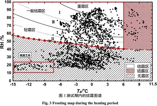 由以上結(jié)果可知,北京地區(qū)有近50%的“干冷”工況處于無霜區(qū)內(nèi),機組極易出現(xiàn)“無霜除霜”的誤除霜事故,而重霜區(qū)的工況則容易出現(xiàn)“有霜不除”的誤除霜事故[2,3],誤除霜事故會不同程度地影響機組正常運行,導致能源浪費。低溫工況位于圖譜無霜區(qū)的左下區(qū)域,低于-5℃的工況占所有工況的12.9%?梢,結(jié)霜和低溫是影響北京地區(qū)空氣源熱泵冬季運行的兩大問題。
