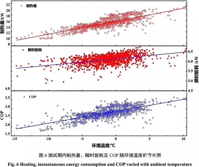 隨環(huán)境溫度上升,制熱量、瞬時能耗和COP均呈上升趨勢;由圖中散點的分布情況可知,測試機組的工況主要集中在-5~5℃的區(qū)間內(nèi),該頻段內(nèi)的工況占據(jù)總工況的84.2%,平均制熱量為15.5kW,瞬時能耗為6.1kW,平均COP為2.83。
