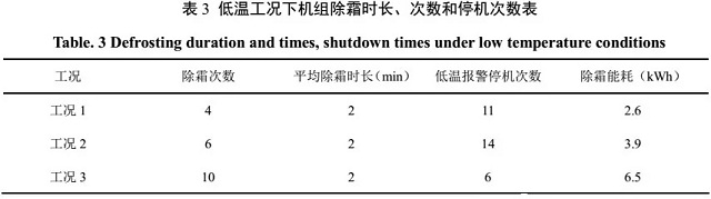由此可見,低溫導致壓縮比超過正常范圍,對壓縮機的正常運行產(chǎn)生了顯著的影響。機組除霜頻次及停機故障。機組除霜時長、次數(shù)及停機故障次數(shù)如表3所示。