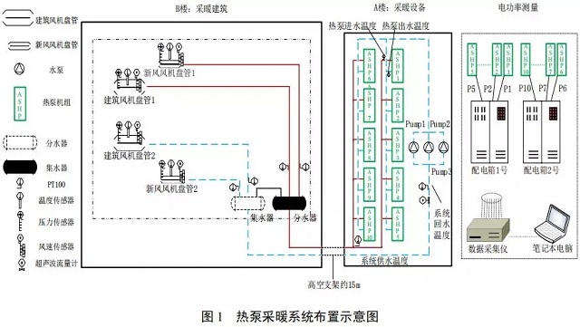 如圖1所示,由于醫(yī)院樓房改造等因素,熱泵機(jī)組及其附屬設(shè)備置于A樓樓頂,距離采暖建筑B樓約15m,兩者之間由供回水管連接。空氣源熱泵采暖系統(tǒng)布置如圖1所示,采暖熱水至采暖建筑B樓分為2路,分別為建筑供暖和新風(fēng)供暖。