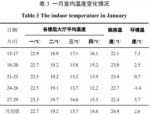 如下表3所示,室外平均干球溫度2.64℃,一/二/三/四樓大廳月平均溫度分別為22.7℃、19.2℃、15.7℃和14.6℃。其中,高樓層大廳用戶窗常開,導(dǎo)致三/四樓大廳室內(nèi)溫度偏低。各樓層病房月平均溫度為:24.9℃。病房人員日間習(xí)慣窗戶微開,保持室內(nèi)空氣流通,故日間室內(nèi)溫度存在小范圍波動(dòng),室內(nèi)溫度基本不低于20℃。