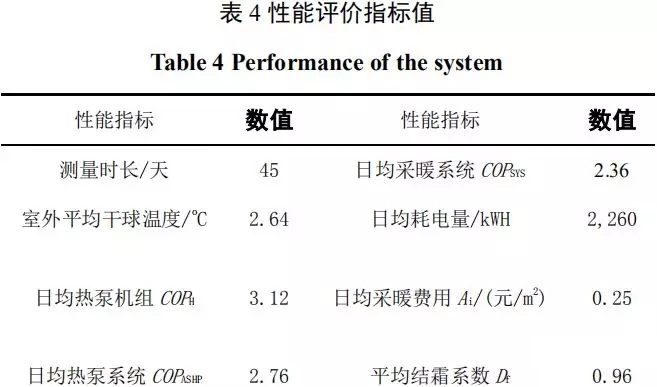 對(duì)各采集數(shù)據(jù)綜合分析,整個(gè)冬季采暖測(cè)試時(shí)間:2016年1月19日~3月4日,共45天。總體性能指標(biāo)如下表4所示,采暖周期內(nèi)平均結(jié)霜系數(shù)為0.96。其中,共有四天結(jié)霜天氣(分別為:1月28日、1月29日、1月31日和2月1日)在換熱器翅片表面有結(jié)霜,結(jié)霜系數(shù)分別為0.96、0.94、0.97和0.98。