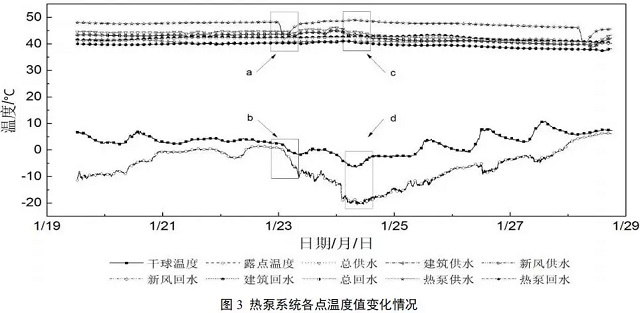 如圖3中c區(qū)域所示,出現(xiàn)測(cè)量周期內(nèi)最冷天氣,日平均溫度為-6.90℃,單臺(tái)熱泵供水溫度均值48.6℃,系統(tǒng)總供/回水建筑、新風(fēng)供水、單臺(tái)熱泵供/回水溫度均出現(xiàn)下降,而建筑回水和新風(fēng)回水溫度基本不變,其日均值分別是42.6℃和41.5℃。