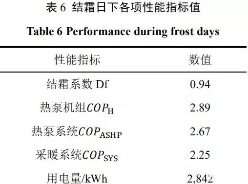 本文選取典型結(jié)霜日(1月29日10:00~1月30日11:00),對(duì)熱泵機(jī)組在結(jié)霜環(huán)境下工況做進(jìn)一步分析。結(jié)霜工況下各項(xiàng)性能指標(biāo)平均值如表6所示: