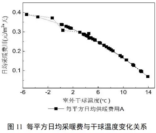 如圖11所示,每平方日均采暖費(fèi)用和室外干球溫度成反比趨勢(shì)。室外干球溫度越高,每平方日均采暖費(fèi)用越低。