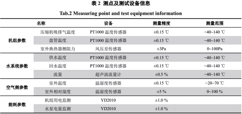 設置自動監測系統,對空氣源熱泵系統機組及水泵關鍵參數進行實時監測,主要包括:室外參數、系統實際運行參數、系統基本能耗等。以上數據均通過計算機實時讀取存儲,存儲頻率1次/min。具體測點及相應測試設備精度如表2所示: