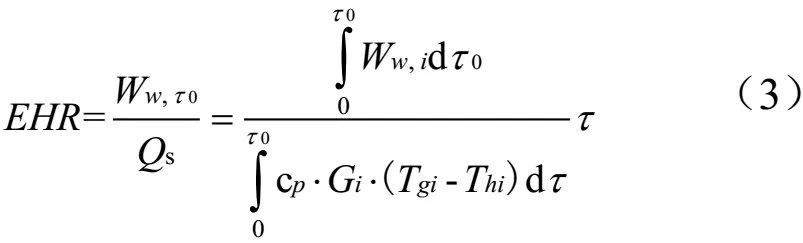 式中:T0為時間,S;Qs為T0時間內熱泵系統的總供熱量,kJ;Wh,r0為T0時間內熱泵機組的耗功量,kJ;Ww,r0為T0時間內循環水泵的耗功量,kJ;cp為水的比熱容,取為4.2;Gi系統循環水質量流量,kg/s;Wh,i為i時刻熱泵機組功率,kW;Ww,i為i時刻循環水泵功率,kW;Tgi和Thi分別是i時刻系統供回水溫度,℃。