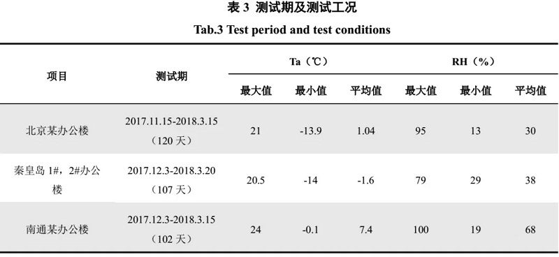 四個測試項目位于不同的氣候區,測試工況特點不同。北京和秦皇島位于寒冷地區,采暖季室外溫度較低,其平均室外溫度分別為1.04℃和-1.6℃。北京地區除部分雨雪天氣室外相對濕度較大外,供暖季整體室外工況較為干燥,相對濕度平均值僅為30%,秦皇島地區相對濕度穩定較低,維持在平均值38%左右波動。南通位于夏熱冬冷地區,室外溫度相對較高,平均值為7.4℃,室外相對濕度較大,測試期間 2/3天數的日平均相對濕度高于70%,相對濕度的均值為68%。具體的測試時間以及日平均室外溫濕度基本信息如表3所示。