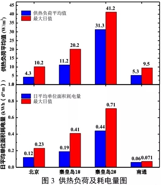 圖3為各項目的實測平均供熱負荷及耗電量,北京某辦公樓、秦皇島1#辦公樓、秦皇島2#辦公樓、南通某辦公樓項目供熱負荷平均值分別為4.3、11.2、31.3、5.3W/平方米,供熱負荷最大日測試值分別為10.2、20.2、41.2、9.5W/平方米。