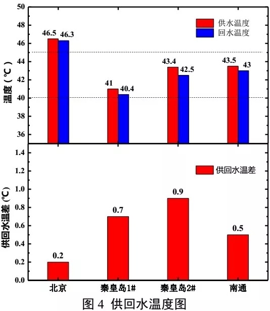 圖4所示為各項目供暖季系統平均供回水溫度,北京某辦公樓、秦皇島1#辦公樓、秦皇島2#辦公樓、南通某辦公樓項目的供回水溫度均值分別為46.5/46.3℃、41/40.4℃、43.4/42.5℃、43.5/43℃,供回水溫度差值分別為0.2℃、0.7℃、0.9℃、0.5℃,供回水溫差均遠遠小于設計5℃溫差,“大流量小溫差”現象明顯。在實際運行過程中,除存在秦皇島2#辦公樓項目人為調節溫度設定值值外,其他項目的日平均供回水溫度值固定不變,供暖系統水溫設定點在實際運行時缺乏調節。