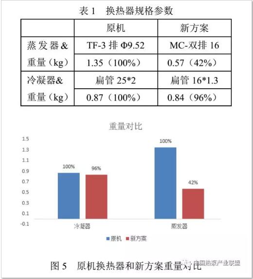 本文蒸發器如圖3所示,采用微通道換熱器替代原機銅管翅片換熱器,可以有效降低重量和成本;冷凝器如圖4所示采用新型微通道扁管,并優化了與內膽外壁面的接觸面積,成本持平的情況下增加了約30%的換熱面積。表1及圖5表示了蒸發器和冷凝器的規格及重量對比。