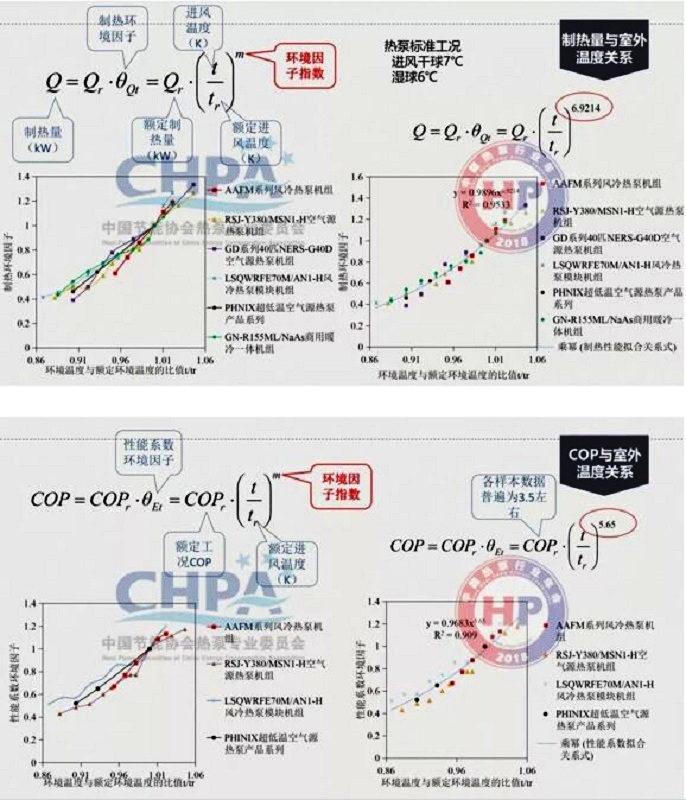 在這個(gè)因子的確定上,我們對(duì)國內(nèi)有影響的廠家生產(chǎn)的熱泵機(jī)組進(jìn)行了數(shù)學(xué)上面的處理;其環(huán)境因子的值在一般情況下,指數(shù)是5.65,建立了這個(gè)數(shù)學(xué)模型。同時(shí),對(duì)于除霜的問題,結(jié)霜是逐步的增厚,厚到一定的程度影響其換熱。為此,我們要求一定要通過除霜進(jìn)行試驗(yàn)。此時(shí),除霜是消耗其它的能量。