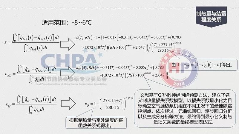 在-15℃到-8℃數(shù)學(xué)模式的圖上可以看到,結(jié)霜的損失系數(shù)用一個(gè)符號(hào)來代表,結(jié)霜的損失一定影響了它的名義制熱量,所以,它有一個(gè)損失系數(shù),會(huì)影響到整個(gè)制熱量的衰減。有了數(shù)學(xué)模型就可用進(jìn)行數(shù)學(xué)計(jì)算,去解決這樣的物理現(xiàn)象。