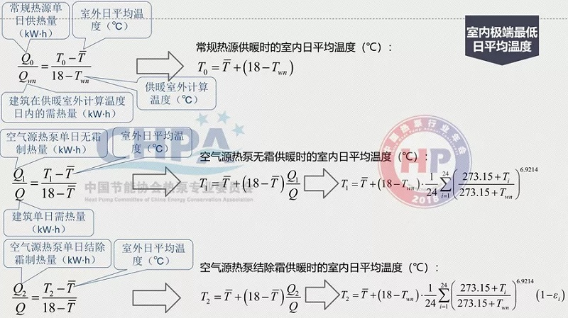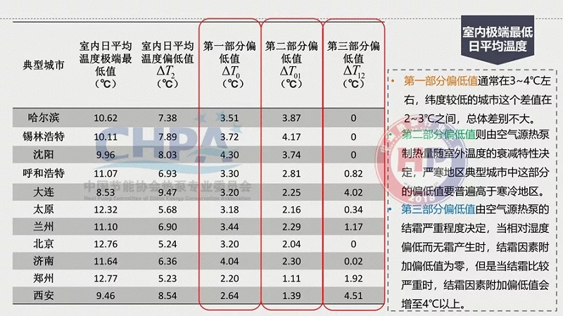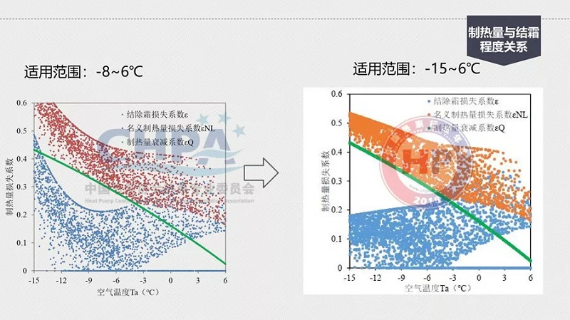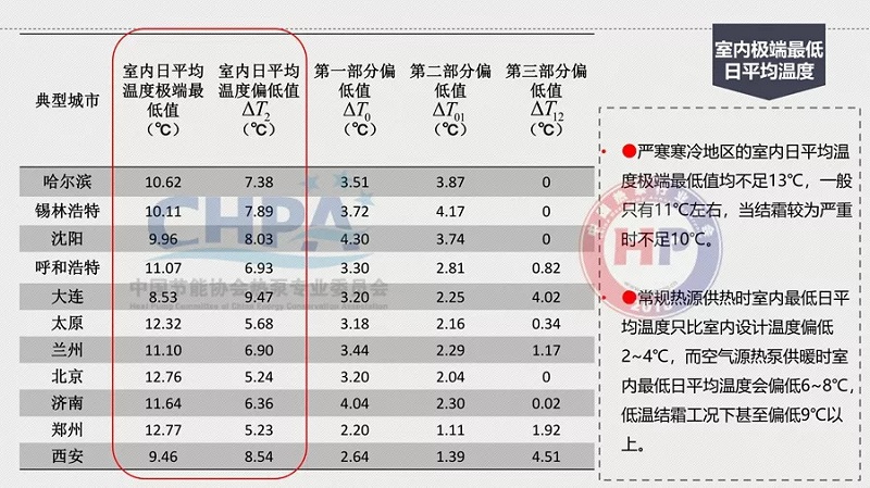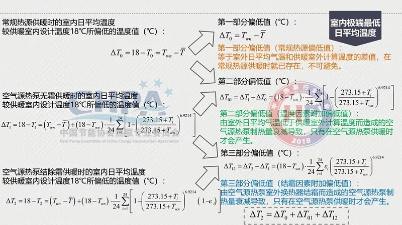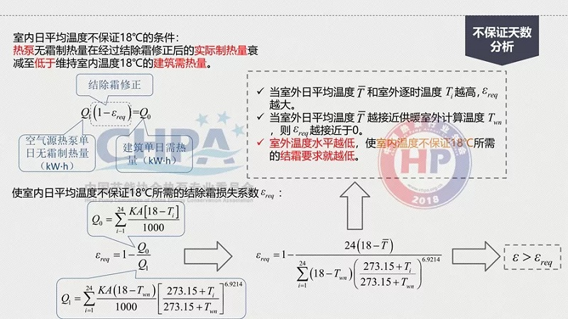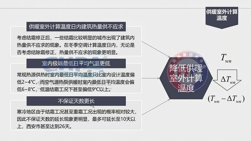 那么,怎么由18℃降到13℃?原因是在統(tǒng)計(jì)規(guī)定室外計(jì)算溫度的時(shí)候,已經(jīng)有了不保證5天的室內(nèi)空氣質(zhì)量。在這樣的情況下,它的偏差就比較大了。其中,室內(nèi)日平均溫度不保證18℃的條件是熱泵無霜制熱量在經(jīng)過結(jié)除霜修正后的實(shí)際制熱量衰減至低于維持室內(nèi)溫度18℃的建筑需熱量。