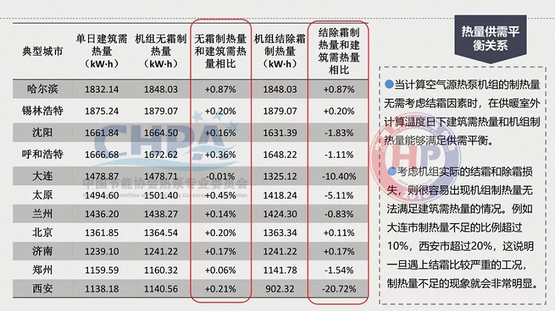 但是實(shí)際上,不是這樣一個(gè)物理現(xiàn)象,結(jié)果是什么?考慮機(jī)組實(shí)際的結(jié)霜和除霜損失,則很容易出現(xiàn)機(jī)組制熱量無法滿足建筑需熱量的情況。例如大連市制熱量不足的比例超過10%,西安市超過20%,這說明一旦遇上結(jié)霜比較嚴(yán)重的工況,制熱量不足的現(xiàn)象就會(huì)非常明顯。
