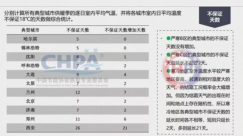 三是不保證天數(shù)更長(zhǎng)。寒冷地區(qū)由于結(jié)霜工況甚至重霜工況出現(xiàn)的概率相對(duì)較大,因此不保證天數(shù)的延長(zhǎng)現(xiàn)象更明顯,最多可延長(zhǎng)至10天以上,西安市甚至達(dá)到26天。